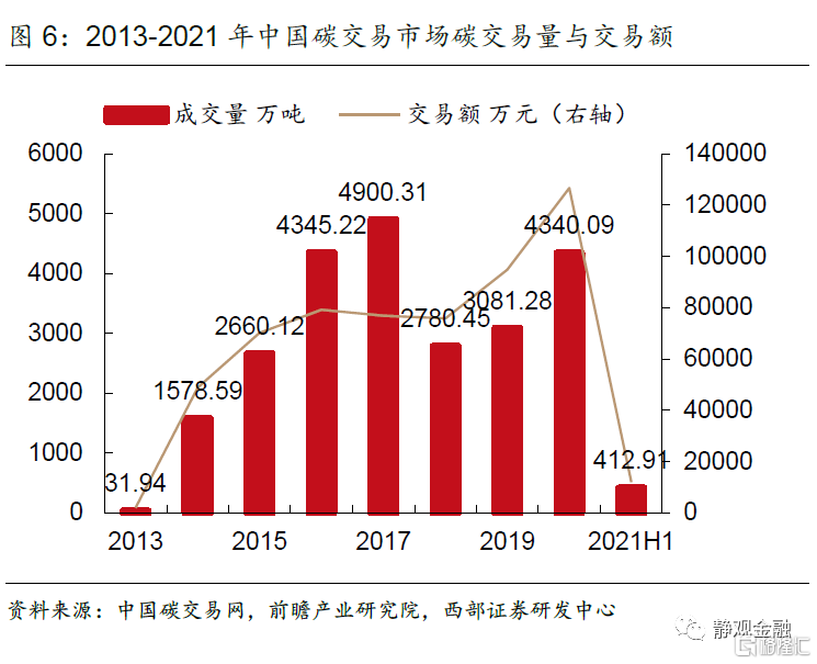 在試點期間,從碳交易量來看,2013-2021年6月,我國共完成碳交易總量24130.91萬噸,其中市場於2017年達到交易峯值4900.31萬噸。在我國碳交易市場交易總額方面,自試點以來我國碳交易市場交易總額約為58.66億元。在交易額變化趨勢上,2013-2020年間,我國碳交易市場碳交易額呈現增長趨勢,截至2021年6月,北京、天津、上海、重慶、湖北、廣東、深圳試點的碳市場累計配額成交量4.8億噸二氧化碳當量,累計成交額約為114億元。