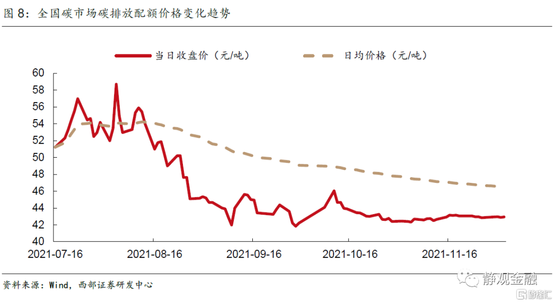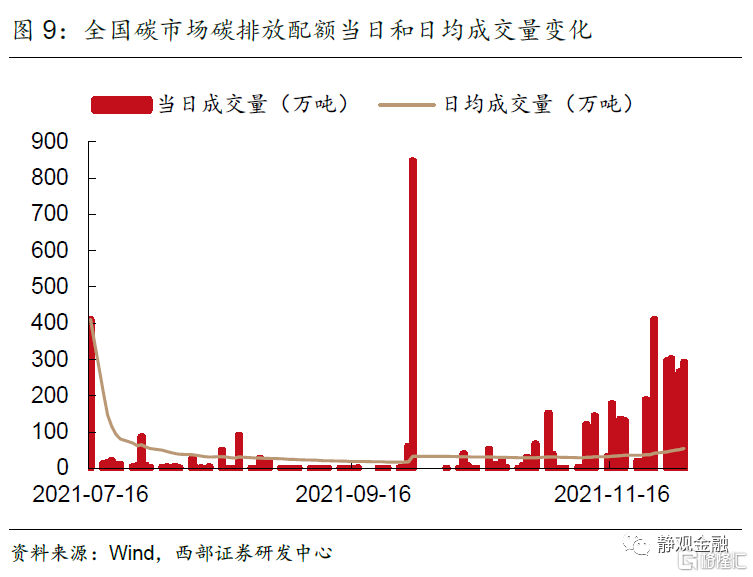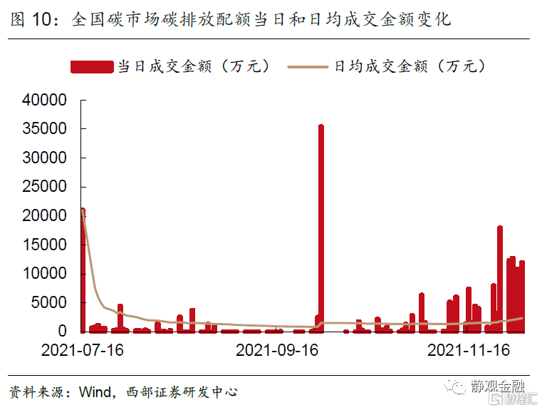 3)全國碳市場開市後成交逐步走弱,臨近履約期開始回暖。全國碳市場開市初期,成交量高開低走,日均成交量從100萬噸以上逐漸回落至20萬噸以下的規模。進入四季度,履約期臨近,總體成交量才開始回暖。成交金額變化趨勢與成交量類似。截至12月3日,全國碳市場累計成交量達到5137.7萬噸,日均成交量為54.7萬噸;累計成交額達到22.0億元,日均成交金額為2336.4萬元。單日最高成交量和金額出現在9月30日,分別達到847.4萬噸和3.5億元,主因是發電行業碳配額核定工作即將完成,在部分企業更加明確自身配額盈缺情況後,引發全國碳市場交易放量。