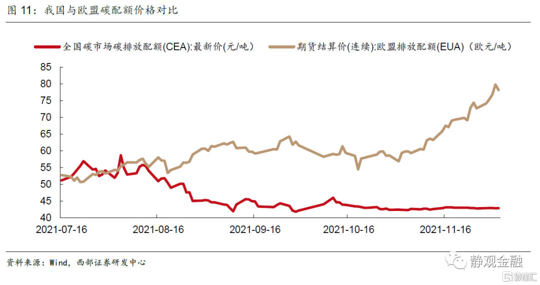全國碳市場開市交易以來,總體運行平穩有序,但始終存在着交易活躍度偏低,流動不足等問題。據有關媒體報道,就企業參與狀況而言,10月以來參與碳交易的企業數較此前上漲約25%,但整體比例仍不高,目前約120家電力企業參與碳交易,佔比僅有6%,多數電力企業入市交易的態度仍相對謹慎[2]。12月3日收盤,我國碳配額價格僅為42.94元/噸二氧化碳當量,而歐盟已達到78.23歐元/噸二氧化碳當量,且碳配額價格還在不斷創下新高。其中影響因素較為複雜,既與近年來歐洲氣候能源政策實施下,碳配額供給收緊有關,又和11月1日《聯合國氣候變化框架公約》第 26 次締約方大會批准建立全球碳市場框架規則,提振碳價上漲預期有關。此外,歐盟碳價上漲還受到今年冬天歐洲氣温偏低、天然氣供應緊張等因素影響。而我國碳市場開市至今活躍度不足,我們認為主要由以下四方面原因造成: