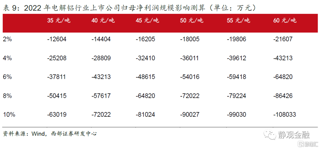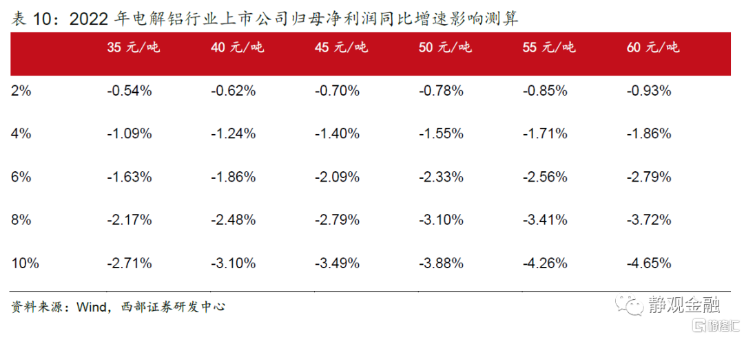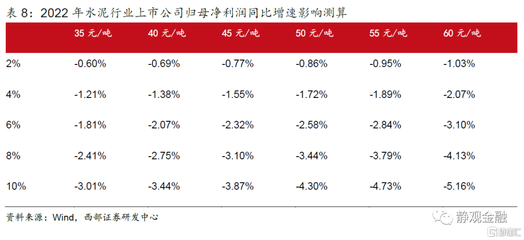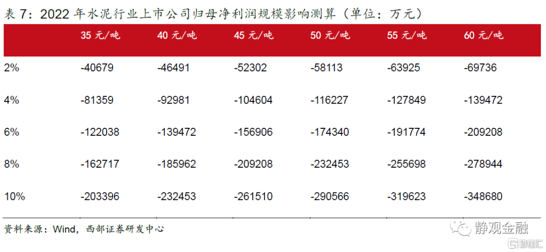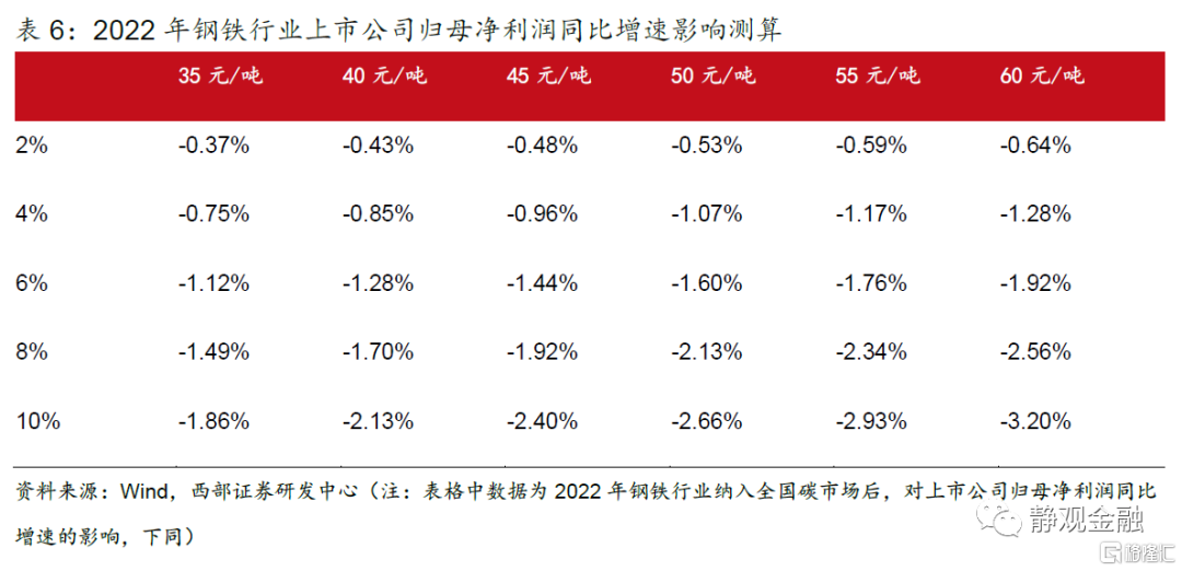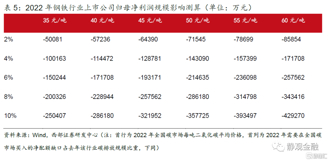假設4:在明年相關行業納入全國碳市場後,設定5種碳配額交易場景,即各行業上市公司碳配額淨缺口分別為2021年碳排放量的2%、4%、6%、8%、10%,假設均需要通過在全國碳市場購買。需要説明的是,在雙碳目標下,碳配額由相對寬鬆向緊平衡方向過渡是必然趨勢。雖然一部分上市公司可能通過技術改造,降低了自身的碳排放量,成為市場上碳配額的出售方,並可能獲得一定的收益,但無論企業通過購買碳配額抑或引入減排技術,在行業被納入全國碳市場後,整體上必然要承擔排放的私人成本和社會成本之間的差距,我們假設這些成本均轉化為碳配額的淨缺口,並通過碳價的變化來體現成本變動。