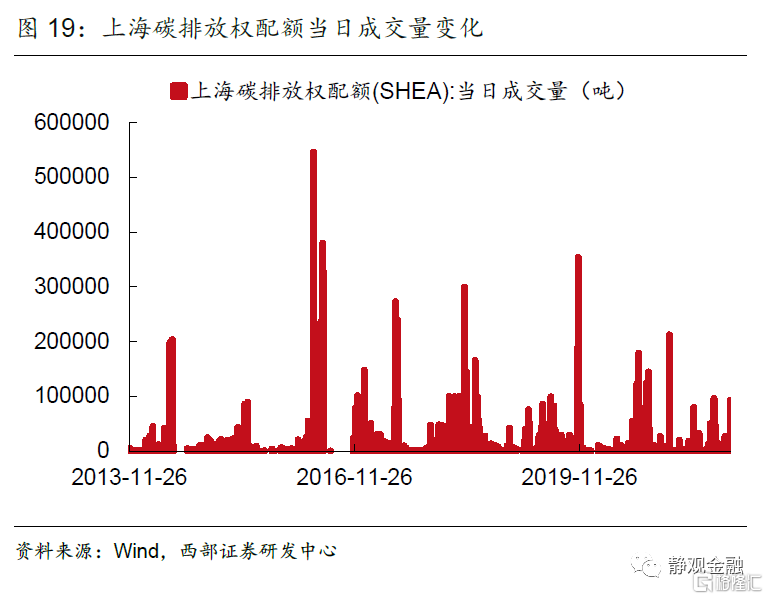 1)參與主體單一。目前全國碳市場參與主體較為單一,納入重點控排名單的2225家企業全部屬於發電行業,同質化程度較高,這意味着不同企業買賣意願的同向性程度也比較高,碳交易要麼擁堵要麼空虛,很難形成穩定而持續的成交量。2)企業缺乏足夠的碳交易經驗。本次納入交易的發電企業,大多數沒有參與過地方試點的交易,對碳交易有關流程、交易規則等方面的理解還有所欠缺,許多企業仍持觀望態度,參與碳市場交易的主觀意願還有待提高。3)碳配額免費分配比例偏高。《實施方案》中提到,對 2019-2020 年配額實行全部免費分配,並採用基準法核算重點排放單位所擁有機組的配額量。免費分配比例較高意味着部分配額充裕的企業或缺乏足夠意願參與碳市場交易。4)缺乏投機性需求補充流動性。目前碳交易市場大量的交易都是實質性的需求交易,並沒有機構和個人投資者參與,缺乏投機性交易來補充市場的流動性。
