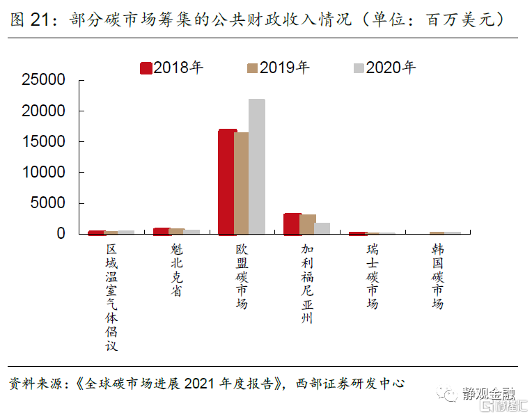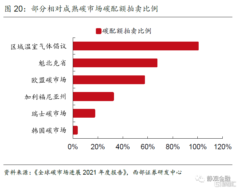 從國際經驗和國內試點實踐看,碳市場交易體系建設初期一般採用全部免費分配或絕大部分配額免費分配的方式,之後不斷增加拍賣在配額分配中的比重。例如,2020年歐盟碳市場57%的碳配額均是通過拍賣方式分配,區域温室氣體倡議中的碳配額甚至100%通過拍賣方式分配。通過有償拍賣的方式一方面可以起到促進碳減排的作用;另一方面,也可以補充政府的公共財政收入,用於資助氣候變化領域項目,支持能源密集型產業以及扶持弱勢及低收入羣體等等。截至2020年底,全球各個碳交易體系已通過拍賣配額籌集了超過1030億美元資金。