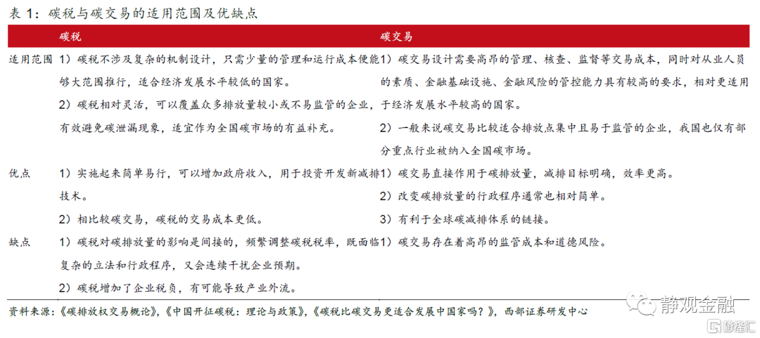 碳税和碳交易均屬於限制碳減排的經濟手段,都能夠通過降低社會總成本以實現碳減排的總體目標。但兩者在實現碳減排的路徑上存在差別,碳税是通過價格調控的方式來實現減排目標,而碳交易則是通過配額這一數量調控工具影響價格進而達到減排目的。具體來看,兩者適用範圍和區別主要體現在以下幾個方面: