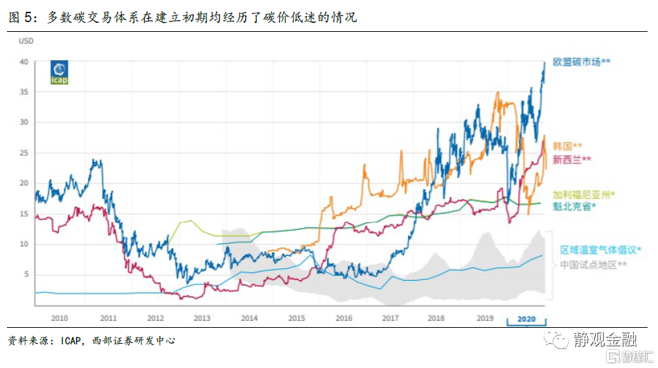 海外市場建設中的經驗和啟示。首先,碳配額過量是海外碳市場發展初期普遍存在的問題。其次,碳市場覆蓋行業範圍逐步擴大,高碳排放行業依次納入。再次,機構投資者的加入活躍了交易市場,為碳市場提供了便利和流動性。最後,碳交易體系對支持區域低碳經濟發展能夠起到積極作用。
