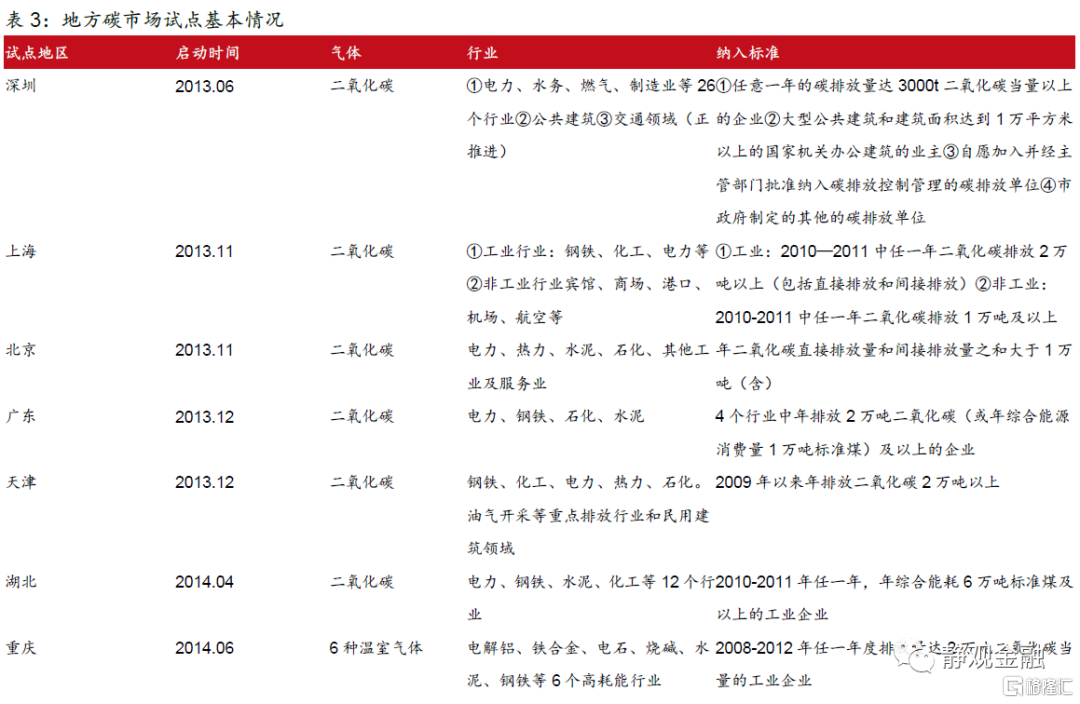 2011年3月16日,《國民經濟和社會發展十二五規劃綱要》公佈,明確提出逐步建立碳排放交易市場。2011年10月29日,國家發改委辦公廳發出《關於開展碳排放權交易試點工作的通知》,同意北京、上海、天津、重慶、湖北、廣東、深圳等七省市開展碳排放權交易試點。2013年年底,深圳、北京、天津、上海、廣東等地相繼開展了碳排放權試點交易,2014年4月湖北試點交易啟動,6月重慶試點交易啟動,2016年9月福建試點交易啟動。