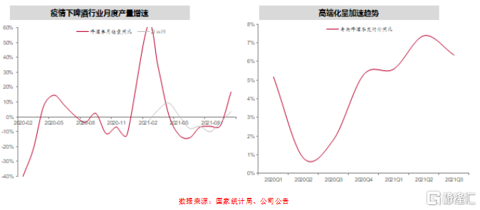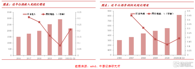 白酒方面:2021前三季度白酒行業收入2184億元,同比增長21%,淨利潤820億元,同比增長19%,2020年受疫情影響收入增速9%;我們預計2020-2021年行業的複合增速接近15%,這一數據與2019年的增速相差不大;茅臺這兩年的增速下來了,如果扣掉這一要素,近兩年行業的增速有望更高一些。