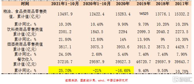 (1)從社會零售統計的數據來看,糧油食品類2020-2021兩年的1-10月的複合增速10.3%,相較於2017-2019年略有加速;菸酒類2020-2021兩年的1-10月的複合增速超10%,相較於2017-2019年7.4-8%的增速有加速