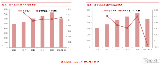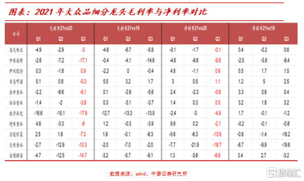 (2)從食品飲料上市公司統計的數據來看,2021年前三季度大衆品上市公司的收入6066億元,同比增長11%,增速環比2020年上升0.6pct,這個增數據與2018-2019年的平均增速很接近;前三季度大衆品利潤456億元,同比變動-2%,增速環比2020年下降22pct;