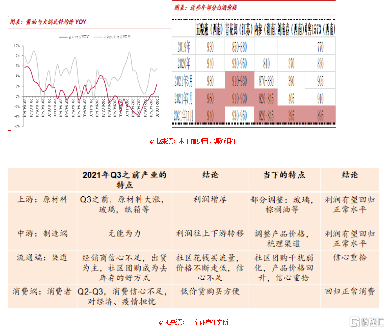 (2)從全產業鏈來看,今年的問題主要出現在價格方面;9月份之前,食品飲料大多子行業情況是上遊材料漲價、終端跌價(幹擾項多),產業鏈利潤是壓縮的,因此上市公司毛利率和淨利潤率出現調整,目前產業鏈利潤在增厚中;