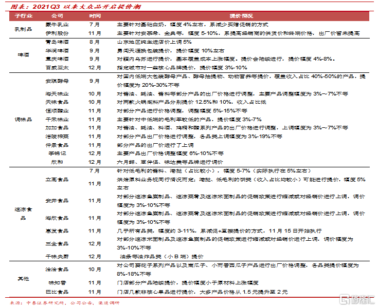 (2)覆盤歷史,啤酒上一輪提價發生在2018年初,當年行業總量保持微增趨勢,與提價前後年份的增速基本保持一致,龍頭啤酒公司提價後經過2-3個季度盈利能力開始明顯回升;醬油上一輪提價發生在2017年初,當年行業保持中個位數的銷量增長,與前後的年份表現基本一致,龍頭公司2017Q1提價後,接下來的2017Q2毛利率迅速迎來提升。而休閒食品、速凍食品等龍頭上一輪提價後銷量也未受到明顯影響,且毛利率基本在提價後的第二個季度即迎來回暖。大衆品的需求相對剛性,3-4年一次的週期性提價對大部分品類的銷量影響較小,通常提價後毛利率會較快出現回升。