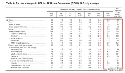 美國勞工部週五公佈的數據顯示,11月美CPI環比上漲0.8%,符合市場預期,但同比漲幅進一步攀升至6.8%,爲1982年6月以來最高水平,也是通脹率連續第六個月超過5%。同時,11月的核心CPI同比增長4.9%,繼續保持在30年來的最高水平。