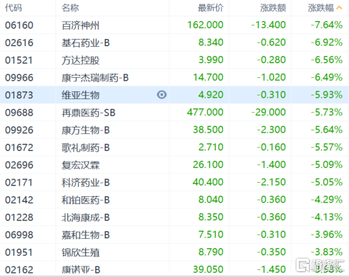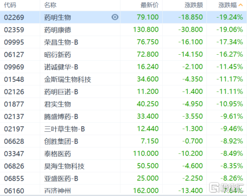 生物技術板塊跳水,藥明康德、藥明生物跌超19%,榮昌生物跌超17%,昭衍新藥跌超15%,諾誠健華、藥明巨諾跌超11%,騰盛博藥跌超9%,泰格醫藥跌超8%,百濟神州跌超7%。