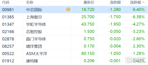半導體板塊跌幅居前,中芯國際、上海復旦跌超6%,華虹半導體跌超4%,芯智控股跌超3%,晶門半導體跌超2%。