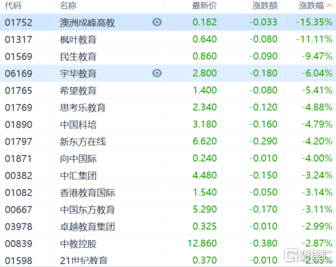 教育板塊走弱,澳洲成峯高教跌超15%,楓葉教育跌超11%,民生教育跌超9%,宇華教育跌超6%。