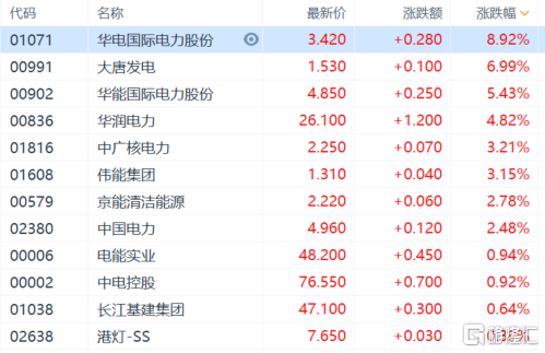 電力板塊漲幅居前,華電國際電力股份漲近9%,大唐發電漲近7%,華能國際電力股份漲超5%,華潤電力漲超5%,中廣核電力漲超3%。