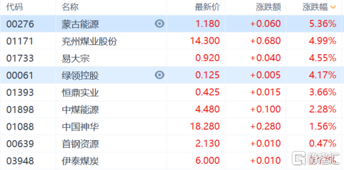 煤炭板塊走強,蒙古能源漲超5%,兗州煤業漲近5%,易大宗漲超4%,中煤能源、中國神華等跟漲。