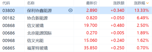光伏股集體上漲,保利協鑫能源漲超13%,協合新能源漲超6%,信義玻璃漲超2%。