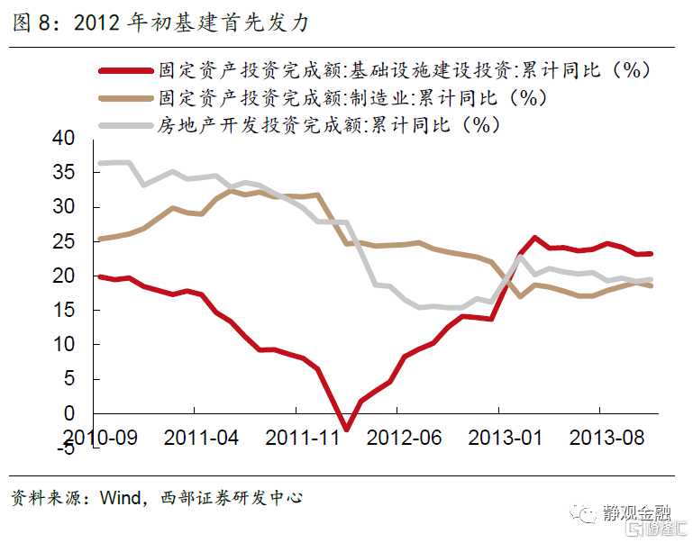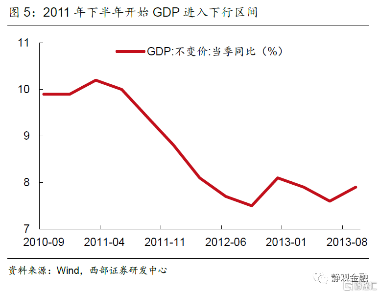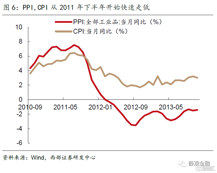 在前期經濟刺激政策的作用下,國內通脹壓力陡增,高通脹壓力下2011年國內收緊貨幣政策,主動調控過熱的經濟。與此同時,海外經濟體債務風險累積,世界經濟復甦步伐放緩,中國出口增速也出現明顯下滑。在內外需同時放緩的情況下,2011年一季度開始GDP增速進入下行階段,由10%持續回落至2012年三季度的7.5%。CPI與PPI從2011年下半年開始快速下行,其中PPI同比增速由7%以上轉為負值,CPI由7%以上跌至2%,經濟面臨通縮風險。人民銀行於年底重啟貨幣寬鬆,在2011 年12月下調存款準備金率0.5%,並隨着2021年上半年經濟增速的快速下行,分別於2月、5月實施了兩次降準,於6月、7月進行兩次降息。