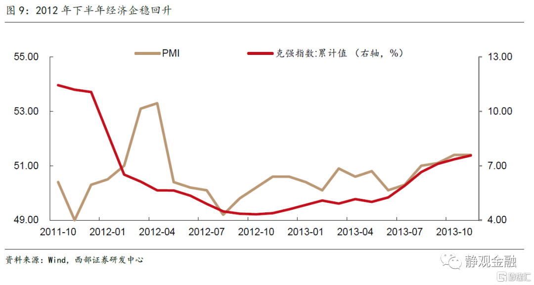 隨着人民銀行下調存貸款基準利率,一般貸款加權平均利率開始走低,企業中長期貸款餘額同比增速開始觸底回升。從2012年9月份起,經濟開始出現企穩回升態勢,克強指數觸底回升,PMI也重回榮枯線以上。當然,在本輪經濟復甦中,財政扮演了重要的角色,2012年,城投債發行量迅速擴張,發行量年度增長142%,發行只數由前一年的324只增長到837只。在財政發力的配合下,央行2012年僅通過兩次降息(貸款基準利率從6.56%下調到6%)就完成了穩增長的基本任務。