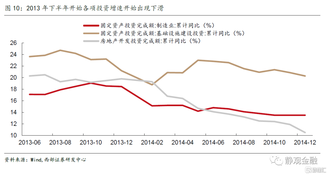 2013 年的政策主線是產業升級轉型,彼時中國一方面面臨着高污染、高耗能的傳統產業佔比過大的問題,當時的政策基調是:“紮實推進產業轉型升級,積極推進產能過剩行業調整,堅決遏制產能過剩和重複建設,推動戰略性新興產業發展,支持服務業新型業態和新型產業發展。”在此過程中,投資快速下滑,並且成為經濟下行的主導力量。