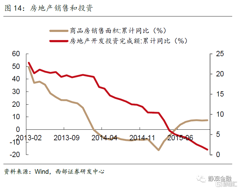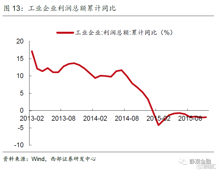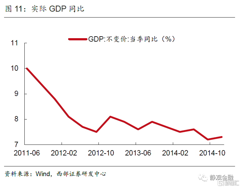 進入2014年,國內經濟自主增長動能持續減弱。PPI同比增速從2012年開始持續小於0,2014年7月開始,PPI同比增速迅速下跌,通縮壓力大,推升實際融資成本,進一步壓制投資,工業企業利潤快速走低並進入負區間。2013年的國五條也使得房地產行業整體處於下行週期。最終在2014年三季度,GDP出現同比增速新低,降至7.2%,人民銀行隨後於2014年11月開啟降息操作。