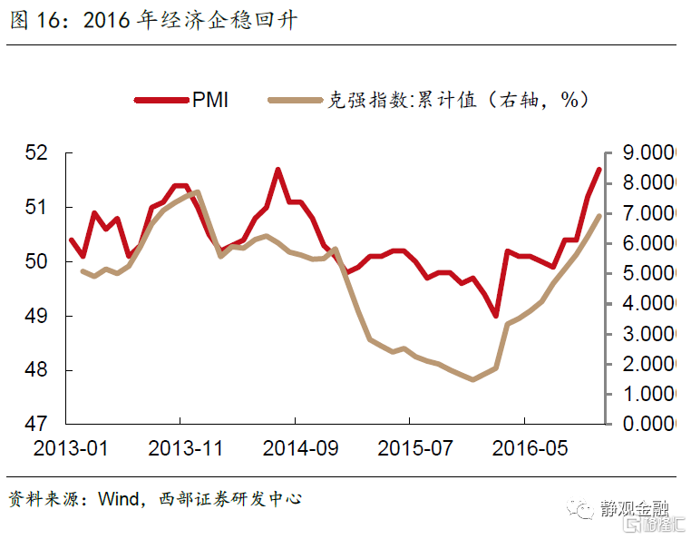 隨着貸款基準利率的大幅下調,我們觀察到一般貸款利率同步快速走低,中長期貸款的增速在逐步回升。最終在2016年初,經濟開始出現企穩回升態勢,克強指數觸底回升,PMI也重回榮枯線以上。