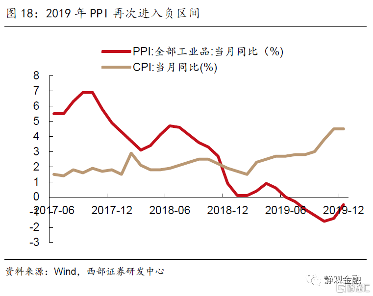 2018年“三大攻堅戰”成為政策工作重心,其中最重要的任務就是金融防風險,而金融防風險主要解決的是宏觀槓桿率過高的問題。在去槓桿的政策背景下,2018 年信用環境偏緊,社融增速從 14.1%大幅下降至 10.3%,下降主要系非標壓降所致,全年委託貸款壓降 1.6 萬億元左右,信託貸款壓降 7000 億元左右,未貼現銀行承兑匯票壓降 6300 億元左右,非標總共壓降 2.9 萬億元左右。2019 年和 2020 年非標又分別壓降了 1.8 萬億元和 1.3 萬億元左右。非標融資規模的壓降對於基建等影響巨大。疊加中美貿易摩擦不斷升級,2018年固定資產投資增速、社會消費品零售增速、工業增加值增速都出現不同程度的下滑趨勢。PPI也呈現下滑態勢,並於2019年重新進入同比負增長區間。