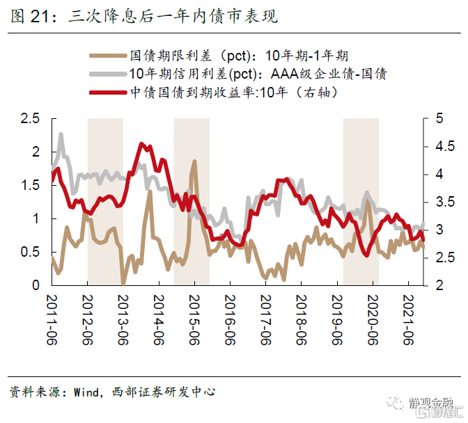 總體而言,降息對債市的影響較為明確,其會帶來利率下行,但也取決於降息的節奏和力度以及實體經濟恢復增長的情況。比如,在2012年6月降息後的半年內就發生了收益率上行的情況,這大概率與2012年降息週期的幅度有關。對於其他兩次降息週期,首次降息半年內,短端收益率都大幅走低,確定性較強。而長端利率則跟實體經濟恢復增長的情況有關。比如,在2014年的降息週期中,人民銀行先後6次下調存款和貸款基準利率,此次降息的特點是降息力度大,降息週期長,國內經濟恢復較慢。期間十年期國債收益率大幅下行,由4.25%下行至2.65%,引發了近十年來債市的最大牛市。另外,在降息週期內,信用利差與期限利率縮小的概率較大。