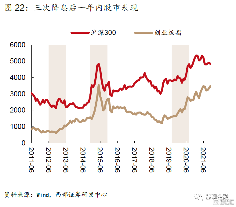 相比之下,降息對股票市場影響途徑一是會降低企業融資成本,刺激實體經濟生產和投資活動,帶動總需求回暖和企業盈利回升。二是短期內降低了無風險利率,使得企業未來現金流的貼現價值變高。但是,如果覆盤之前三輪降息週期中的股市表現,可以看到以創業板指數為代表的成長風格股票表現明顯好於代表價值的滬深300指數。這説明降息在過去對於股市的作用更多的是體現在風險偏好的提升。特別值得一提的是2014-2015年的降息週期中,股票市場經歷了大起大落。從2014年底開始,隨着人民銀行開啟降息,降低了資金,同時釋放了大量流動性。由於當時金融監管的割裂,大量廉價資金流向了股市,使得股票市場槓桿越來越高,泡沫化明顯,隨着2015年中監管的介入,槓桿資金出現踩踏,股市出現大幅度調整。總之,降息對於股票市場的風險偏好影響明顯,在利率下行的階段,成長風格的股票表現一般優於價值股,儘管對於價值股而言,無風險利率的下行會使得企業未來現金流的貼現價值變高。