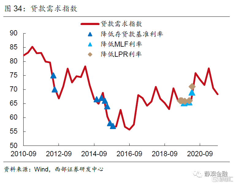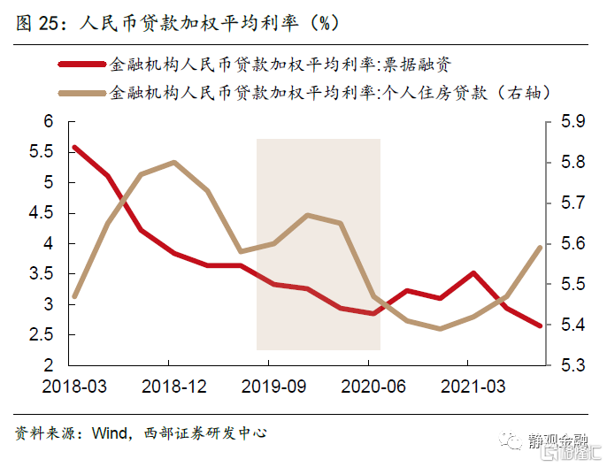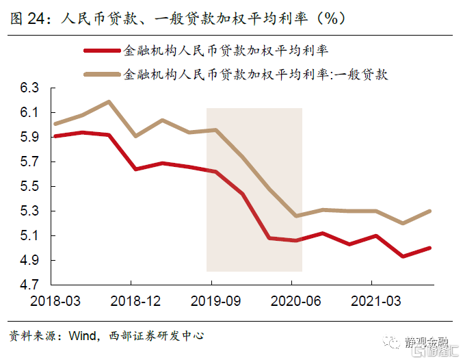 從央行操作到實體經濟融資成本的傳導時間來看,調整政策利率與調降LPR可以較快體現在實際貸款利率上。2019年9月至2020年4月央行頻繁的寬鬆操作,傳導到實際貸款利率的速度較快,尤其在2019 四季度-2020二季度實際貸款利率下行明顯。而這8個月的頻繁操作期之後,政策利率在長時間內一直維持不變。從2020年5月開始,1年期MLF利率、7天逆回購利率一直保持在2.95%、2.20%;1年LPR、5年LPR利率分別保持在3.85%、4.65%;存款準備金率直到2021年7月才再次下調。在2020年5月以後的降息空窗期內,一般貸款加權平均利率基本平穩,從2020二季度的5.26%上升至2021年三季度的5.30%。