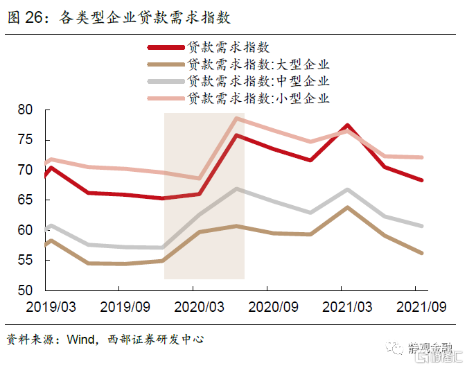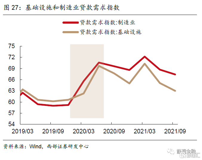 在央行連續進行一系列降息、降準、降LPR操作後,由於融資成本下降,企業融資在2019 四季度至2020 二季度期間受到明顯提振。貸款需求指數一度從2019 二季度的高點70.4%跌至2019 四季度的谷底65.3%,隨後政策利好下,連續上升兩個季度至75.8%的高位;其中大型企業、中型企業、小型企業的貸款需求指數分別提升5.8、9.8、9.0個百分點;基礎設施、製造業企業分別提升9.1、11.4個百分點。從2021年二季度開始,各類型企業的融資需求再次進入下行期間。