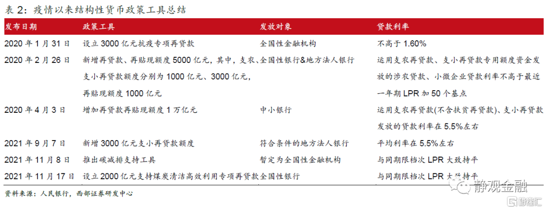 結構性貨幣政策中包含央行的結構性調節要求,僅適用於特定金融機構,或限制信用投向僅為特定行業或企業。《要繼續合理運用好結構性貨幣政策工具》一文中提到:“中國人民銀行不斷創新和豐富結構性貨幣政策工具,創設中期借貸便利、常備借貸便利、支農支小再貸款等,運用定向降準,發揮好宏觀審慎評估的逆週期調節和結構引導作用,優化流動性的結構和佈局”[1]