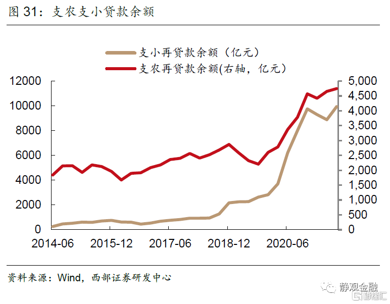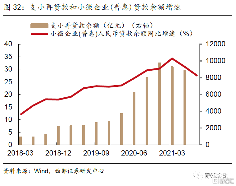 根據央行的統計報吿a,實體經濟的貸款需求2021年3月以來一直處於下降狀態,唯一保持貸款需求相對穩定的是小型企業,也是前期人民銀行結構性貨幣政策工具主要目標對象。這也從側面反映了再貸款、再貼現這類帶有定向性質的結構性貨幣政策工具的有效性。以支小再貸款工具使用為例,可以明顯的發現銀行對於小微企業貸款的同比增速與該工具的使用量有較強的正相關關係。