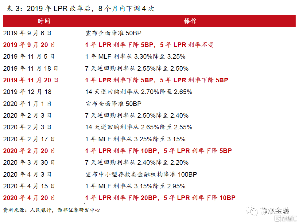 此後,LPR利率在8個月內下調4次,分別在2019年9月、11月和2020年2月、4月。另外,在2019年9月至2020年4月的這8個月內,人民銀行3次下調MLF利率、2次下調7天逆回購利率、2次下調14天逆回購利率、2次全面降準、1次定向降準。由於LPR利率報價是由MLF利率加點形成,政策利率下降可以降低銀行負債端成本,從而帶動LPR報價下行。