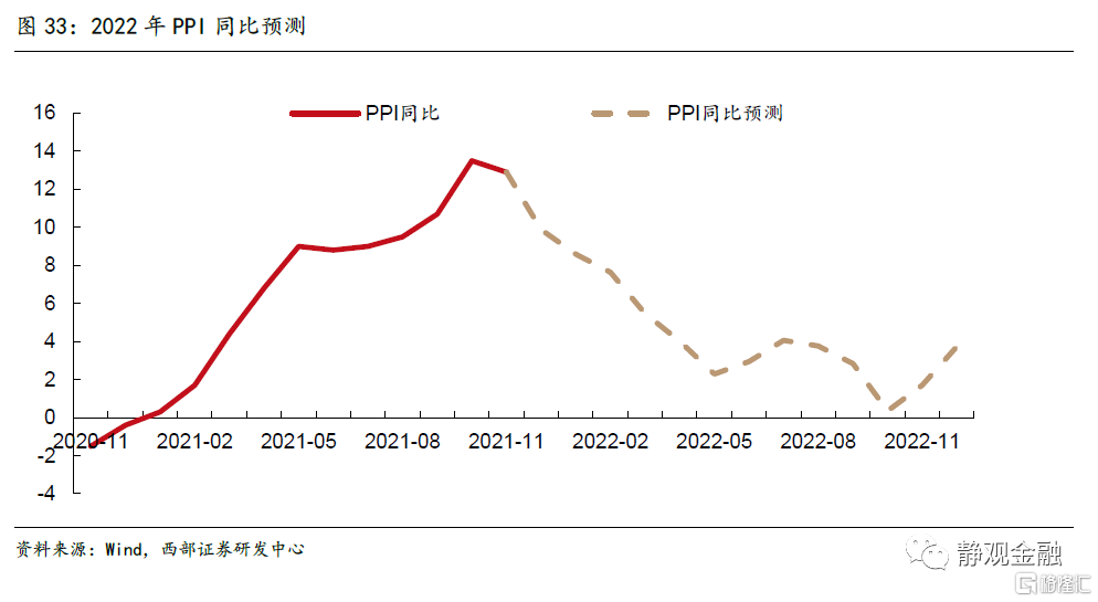 從第二點來評估,明年PPI同比中樞大概率明顯下移,但不至於轉負。隨着明年疫情影響的減弱,海外供應鏈將延續修復態勢,疊加運輸效率的提升,港口擁堵、船期紊亂的局面亦將有所改善,預計全球大宗商品的供給有望改觀。此外,面臨高通脹壓力,各國寬鬆政策或將逐步退出,需求端將隨之迴歸常態。高基數下預計明年 PPI 增長中樞將下行,全年均值約為 4%。預計 2021 年 PPI 增長中樞在 7.9%左右,基數效應下,2022 年 PPI 大概率回落。整體上看,明年 PPI 同比呈下行趨勢,上半年 PPI 同比回落,下半年同比低位運行。