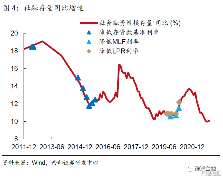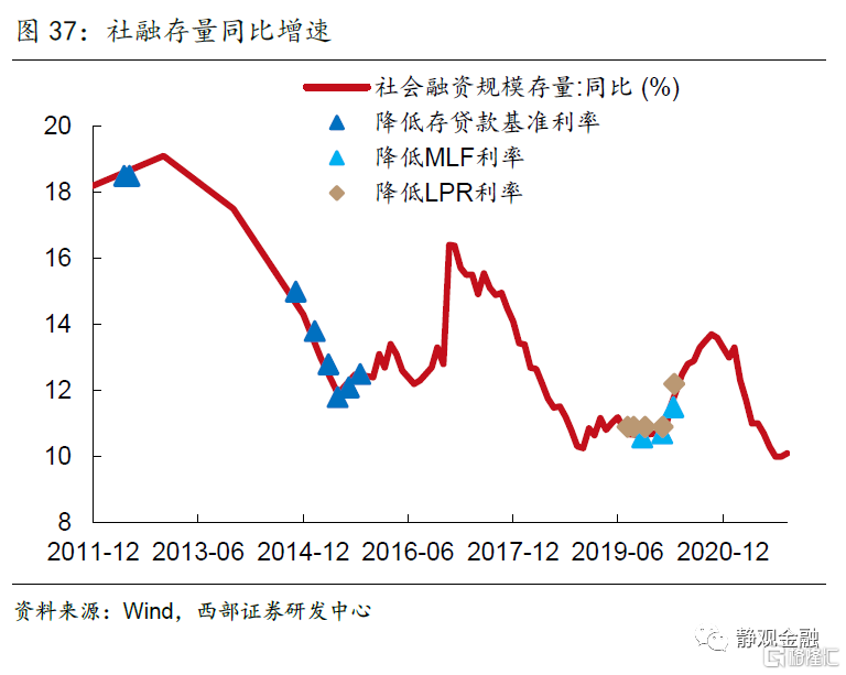 全面降息作為人民銀行最重要的逆週期調節工具,其有效性往往可以通過宏觀槓桿率的回升來觀察。如果根據宏觀槓桿率同比變動幅度的走勢劃分,過去十年間有明顯上升的時間區間分別為:2011年底~2013年二季度,2015年二季度~2016年二季度,2018年底~2020年三季度等三輪。而它們與降息週期是部分重疊的。