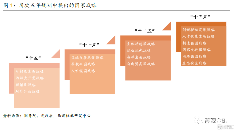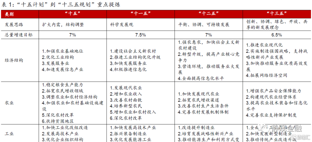 爲適應21世紀經濟全球化趨勢增強、科技發展迅速、產業結構調整步伐加快的環境,“十五計劃”首次確定經濟結構的戰略性調整,目標是實現產業結構優化升級,產品國際競爭力增強。但“十五”時期存在部分行業盲目擴張、產能過剩的現象,因此“十一五規劃”提出全面貫徹落實科學發展觀,轉變經濟增長方式,加快建設資源節約型、環境友好型社會。2010年前後中國經過劉易斯拐點,人口紅利步入“下坡道”,“十二五規劃”的提出是爲了解決經濟社會發展中不平衡、不協調、不可持續的發展,統籌兼顧、改革創新,發揮“質量型”人口優勢。“十三五規劃”進一步明確創新、協調、綠色、開放、共享的新發展理念,發展動力向科技創新驅動轉變。