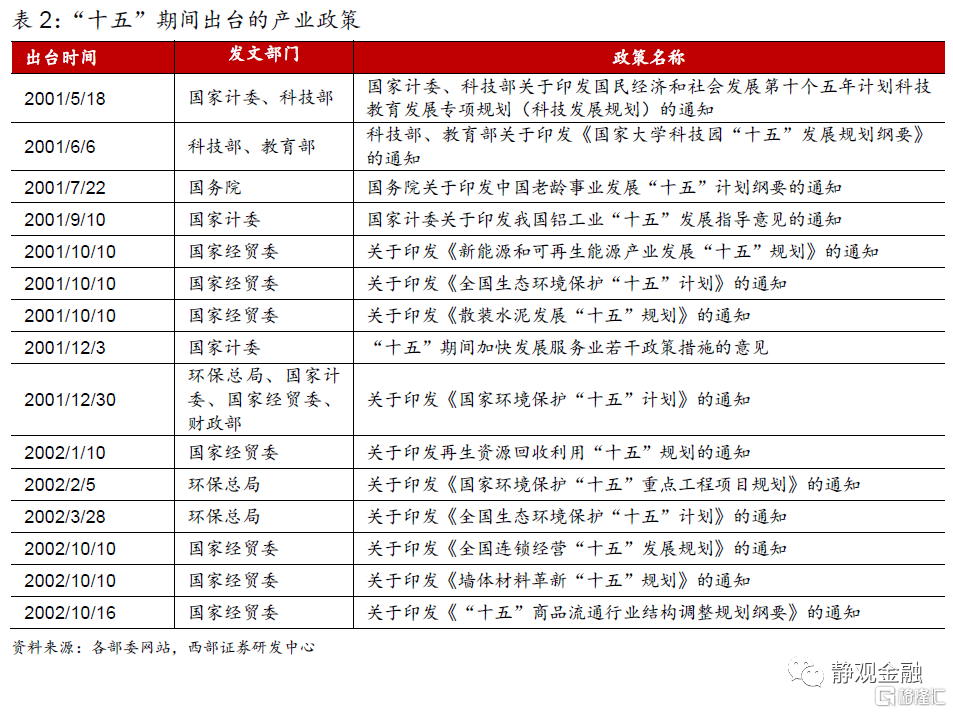 爲簡單起見,本文僅扒取國家層面的產業政策(下同)。“十五”期間共出臺15條產業政策,其中5條指向環保、3條支持服務業、2條支持原材料、2條支持化工、2條支持科技教育、1條支持養老。