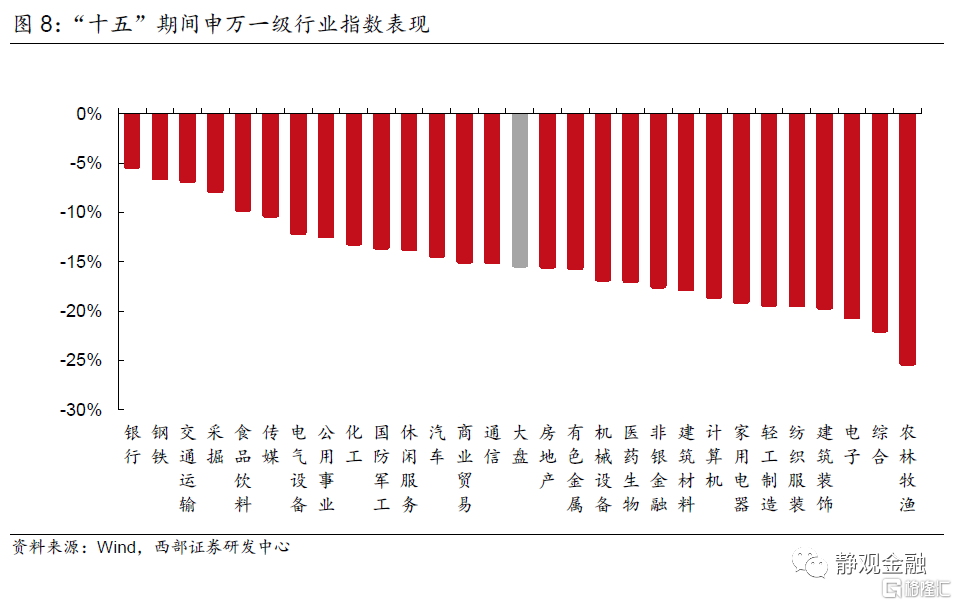 “十五”期間萬得全A年漲幅-15.3%,申萬28個行業指數均收跌。其中比較抗跌的行業爲銀行(-5.3%)、鋼鐵(-6.5%)、交通運輸(-6.7%)、採掘(-7.8%)、食品飲料(-9.7%)、傳媒(-10.2%)、電氣設備(-12.0%)、公用事業(-12.4%)、化工(-13.1%)。這些行業無一例外在“十五計劃”或期間出臺的產業政策中均有提及,因此無論是政策主線抑或是資本市場均指向同一種風格:週期與金融。