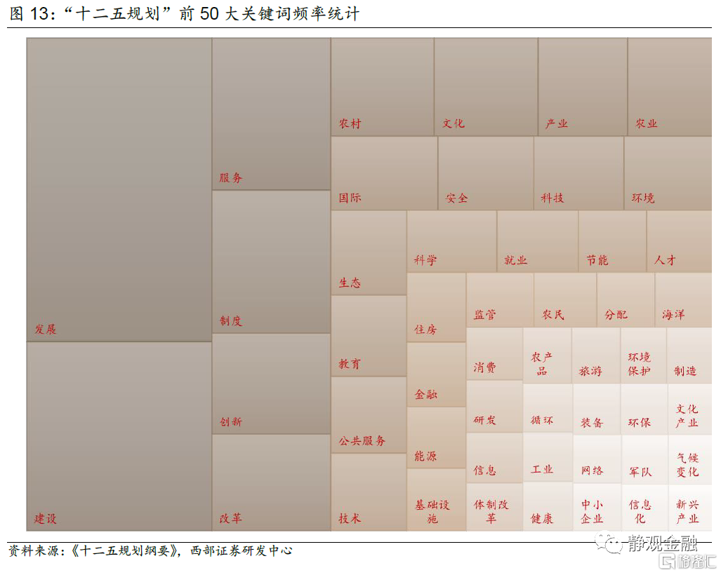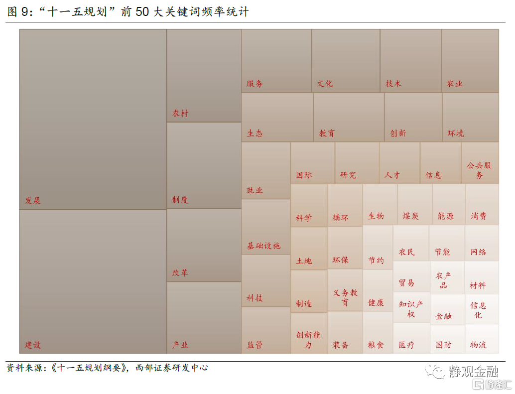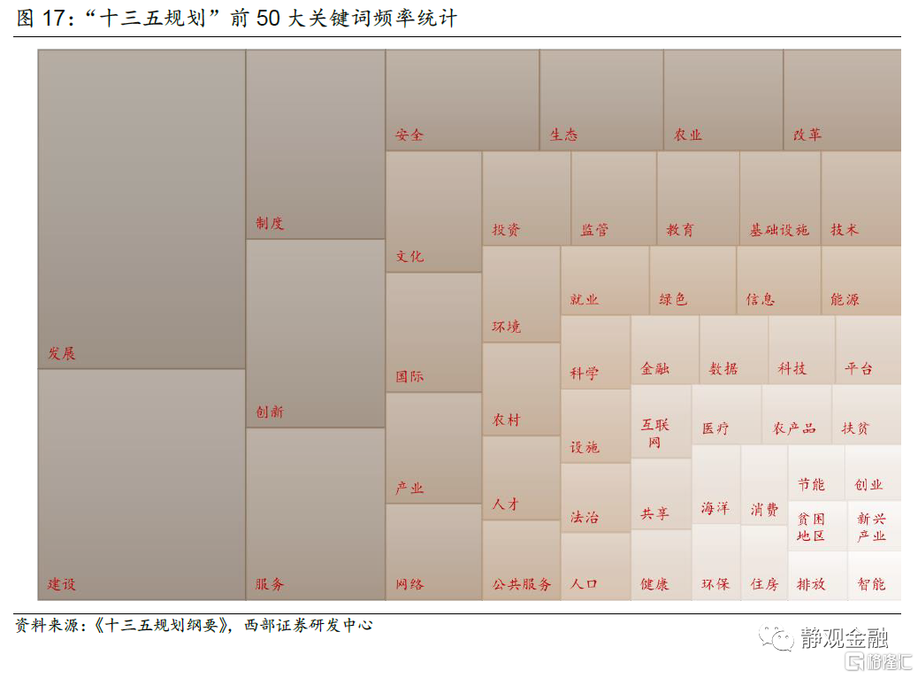 基於對“十五計劃”到“十三五規劃”的文本挖掘,我們用樹狀圖展示歷次五年規劃的前50大關鍵詞,面積越大代表該詞語出現頻率越高。同時,我們還梳理了歷年規劃中大力支持、鼓勵發展或退出支持的產業和行業(暫時不考慮農業,下同)。