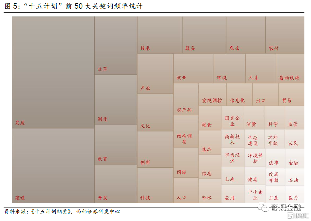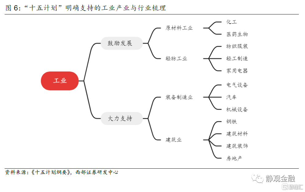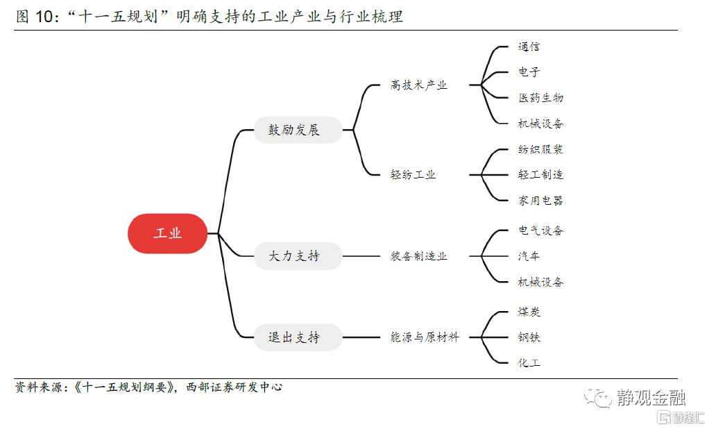 “十五計劃”分爲10篇、26章、33頁,前50大關鍵詞中與產業相關的有教育、技術、服務、文化、科技、出口、貿易、消費、法律、金融。工業方面,“十五計劃”大力支持裝備製造業和建築業,鼓勵發展原材料工業和輕紡工業。服務業方面,“十五計劃”鼓勵發展食品飲料、休閒服務、商業貿易在內的生活性服務業,以及交通運輸、銀行、非銀金融、通信在內的生產性服務業。
