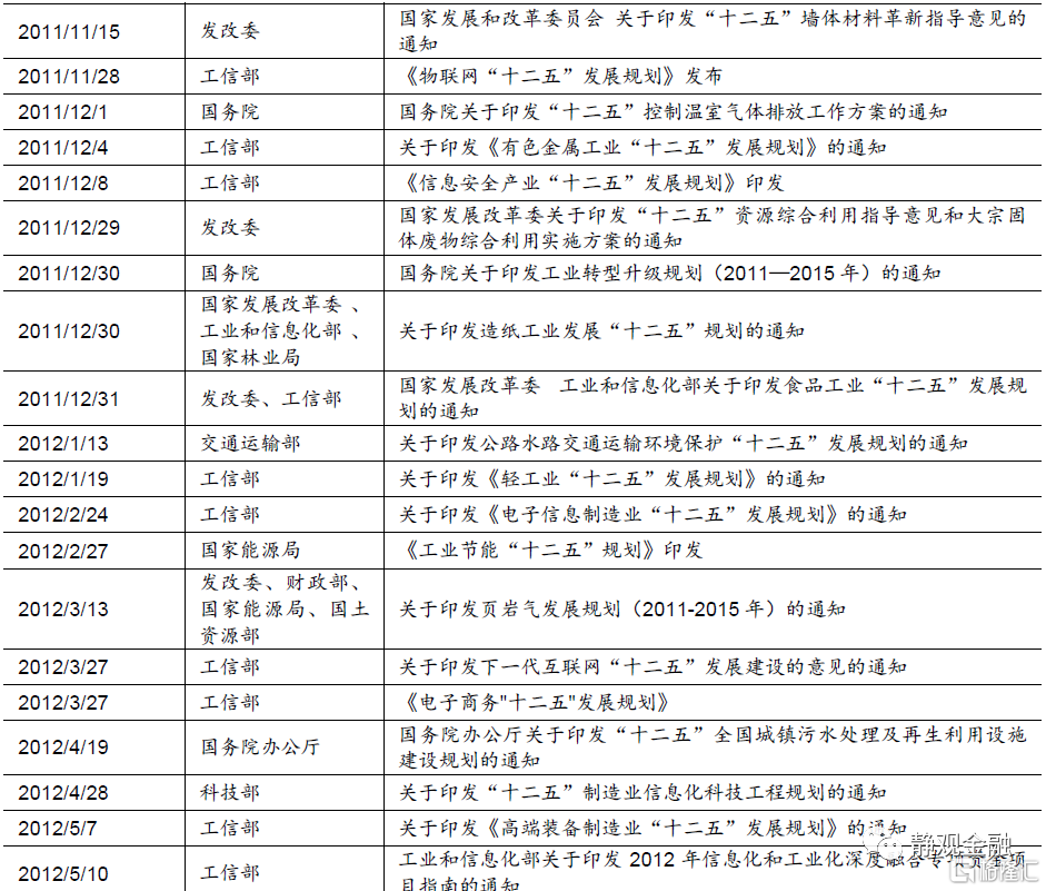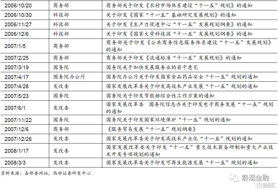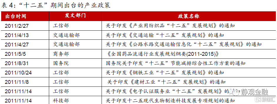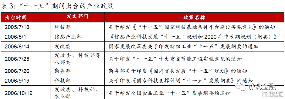 “十一五”政策主線:製造業與消費。1)“十一五規劃”定調:振興裝備製造業,鼓勵發展高技術產業和輕工業,同時對煤炭、鋼鐵、化工等領域調結構、去產能。2)產業政策:共出臺23條,重點在科技、消費與製造。3)資本市場:萬得全A年漲幅31.9%,申萬28個行業指數均收漲,電氣設備、機械設備、醫藥生物更爲突出。