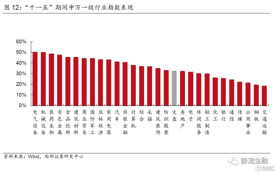 “十一五”期間萬得全A年漲幅31.9%,申萬28個行業指數均收漲。其中漲幅靠前的行業爲電氣設備(49.6%)、機械設備(49.3%)、醫藥生物(48.1%)、有色金屬(47.0%)、食品飲料(44.8%)、建築材料(44.8%)、商業貿易(43.8%)、國防軍工(43.7%)、農林牧漁(42.7%)。除農林牧漁外,在“十一五規劃”或期間出臺的產業政策中支持的行業均在其列。結合政策主線和資本市場看“十一五”的風格爲:製造業與消費。