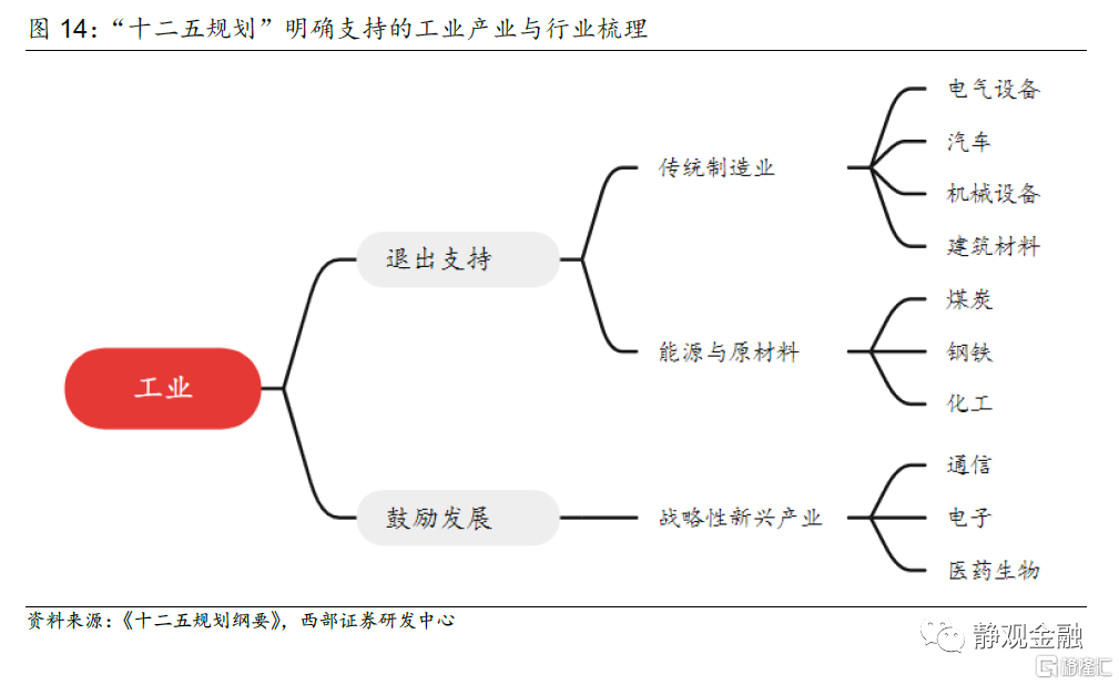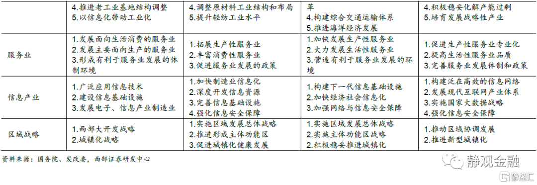 但市場更關心的是五年規劃對於產業、行業乃至相關資產的影響。事實上,在歷次五年規劃中,國家都會指明未來重點扶持的產業和行業。接下來,本文的二到五部分主要釐清以下三個問題:第一,歷次五年規劃中對各類產業定調(鼓勵支持、退出支持)如何?第二,五年規劃如何影響接下來幾年產業政策出臺的節奏?第三,對A股市場有什麼影響?