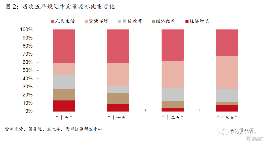 以“戰略”爲關鍵詞檢索,“十五”期間國家層面的戰略包括四項:可持續發展戰略、西部大開發戰略、城鎮化戰略、對外開放戰略;“十一五規劃”在“十五”的基礎上提出區域發展戰略、科教興國戰略和人才強國戰略,政策重心開始向人才和教育傾斜;“十二五規劃”進一步納入主體功能區戰略、自由貿易區戰略、就業優先戰略和海洋發展戰略,表明政策側重於內外循環、民生和生態;“十三五規劃”首提創新驅動發展戰略、人才優先發展戰略、製造強國戰略、國家大數據戰略、網絡戰略、生態安全戰略,政策重點開始向新經濟、新興產業轉變。21世紀尤其是“十三五”以來創新、科技、生態環境變得越來越重要,中高端製造業、互聯網、大數據等新興產業成爲政策重心。此外,從歷次規劃提出的經濟發展指標看,“十五”起經濟增長和經濟結構兩類指標佔比越來越低,而科技教育、資源環境、人民生活等指標的權重越來越高。