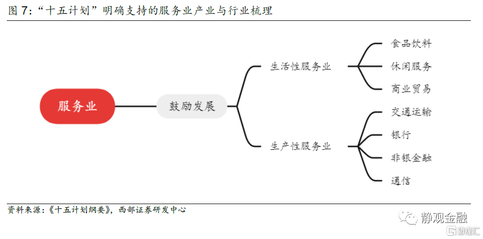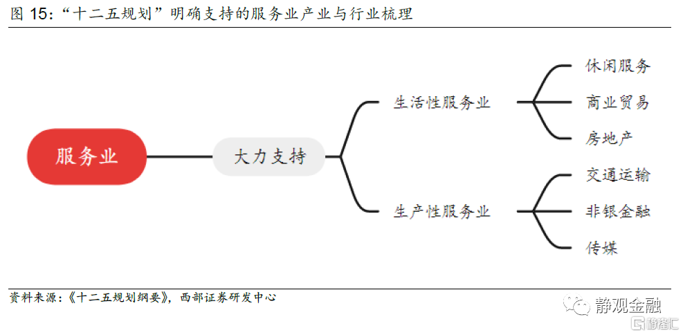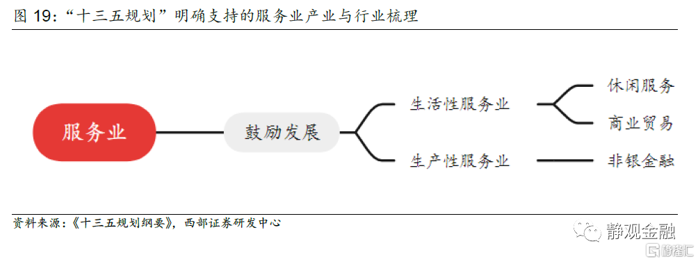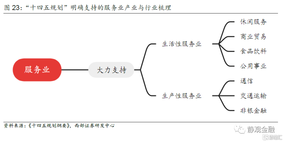 服務業方面則延續了“十三五”的思路,一方面“推動生產性服務業向專業化和價值鏈高端延伸”,鼓勵發展的領域包括供應鏈金融、信息數據、人力資源、現代物流,另一方面“推動生活性服務業向高品質和多樣化升級”,加快發展健康、養老、託育、文化、旅遊、體育、物業等領域並與信息技術融合。
