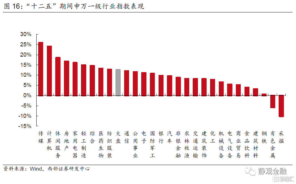 “十二五”期間萬得全A年漲幅12.6%,申萬28個行業指數漲多跌少。其中漲幅前10的行業爲傳媒(25.8%)、計算機(24.0%)、休閒服務(18.4%)、房地產(16.7%)、家用電器(16.0%)、輕工製造(14.9%)、綜合(14.6%)、醫藥生物(13.2%)、紡織服裝(12.8%)、通信(12.0%)。這些行業無一例外在“十二五規劃”或期間出臺的產業政策中均有提及,不過規劃鼓勵的交通運輸和商業貿易行業表現平平,而政策退出支持的行業如電氣設備、機械設備、上遊原材料則表現很差。結合政策主線和資本市場看“十二五”的風格爲:服務業與輕紡工業。