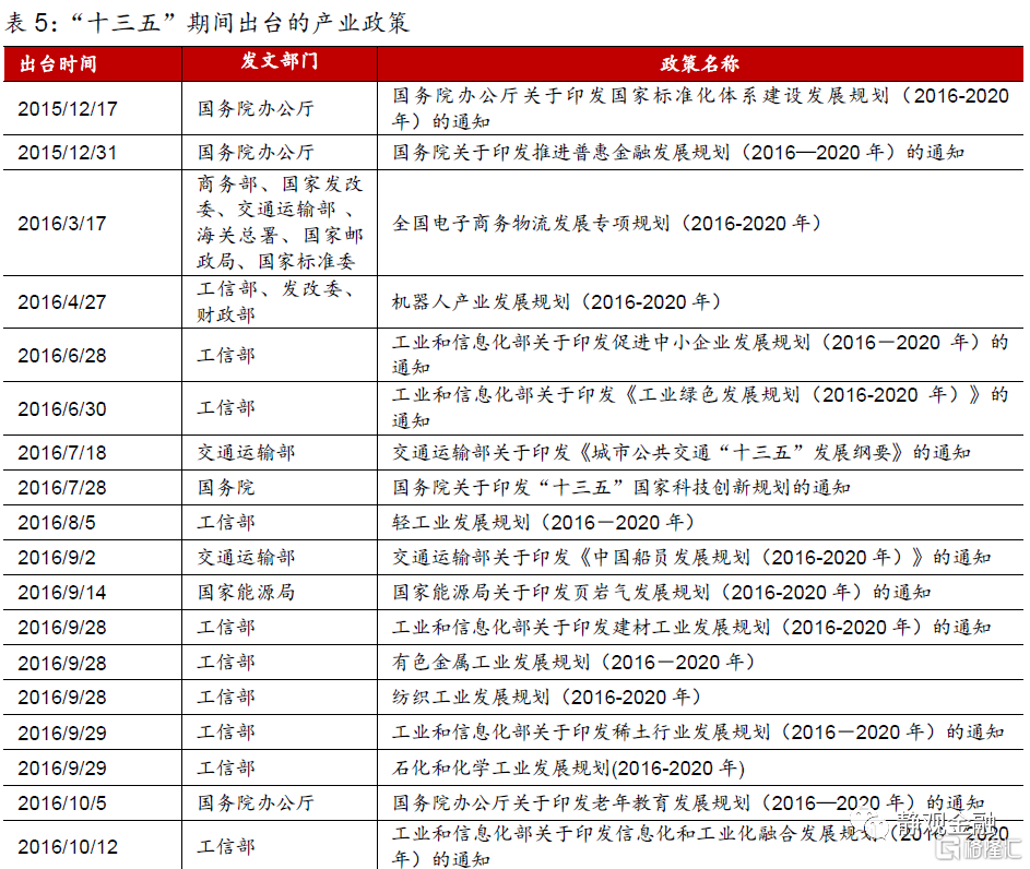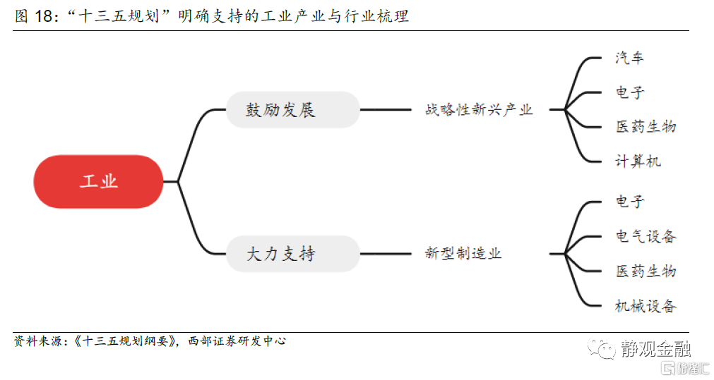 對於傳統製造業,規劃提出要“推動石化、鋼鐵、有色、建材等原材料產業佈局優化和結構調整,擴大輕工、紡織等優質產品供給,加快化工、造紙等重點行業企業改造升級”;對於先進製造業,規劃提出要“推動集成電路、航空航天、船舶與海洋工程裝備、機器人、先進軌道交通裝備、先進電力裝備、工程機械、高端數控機牀、醫藥及醫療設備等產業創新發展”;對於戰略性新興產業,政策重心落在“新一代信息技術、生物技術、新能源、新材料、高端裝備、新能源汽車、綠色環保以及航空航天、海洋裝備”等行業。