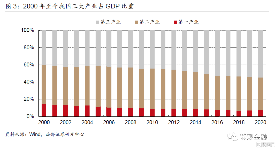 2)“十一五規劃”提出“建設社會主義新農村,推進農業結構戰略性調整”,要“推進工業結構優化升級,把增強自主創新能力作爲中心環節,繼續發揮勞動密集型產業的競爭優勢”,並“提高服務業的比重和水平”。因此“十一五”期間第一產業佔比由11.6%降至9.3%,第二產業佔比由47.0%降至46.5%,第三產業佔比由41.3%升至44.2%。