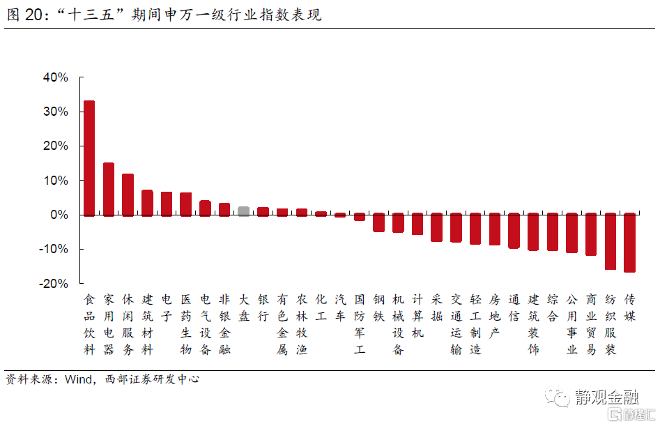 “十三五”期間萬得全A年漲幅1.8%,申萬28個行業指數跌多漲少。其中領漲的前10大行業爲食品飲料(32.7%)、家用電器(14.6%)、休閒服務(11.5%)、建築材料(6.7%)、電子(6.2%)、醫藥生物(6.0%)、電氣設備(3.6%)、非銀金融(2.9%)、銀行(1.8%)、有色金屬(1.3%)。除建材、有色金屬外,其餘行業在“十三五規劃”或期間出臺的產業政策中均有提及。結合政策主線和資本市場看“十三五”的風格爲:消費與中高端製造。